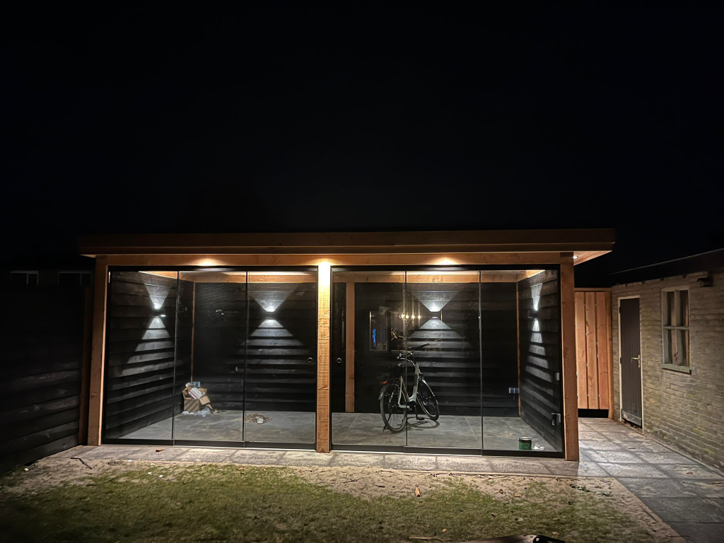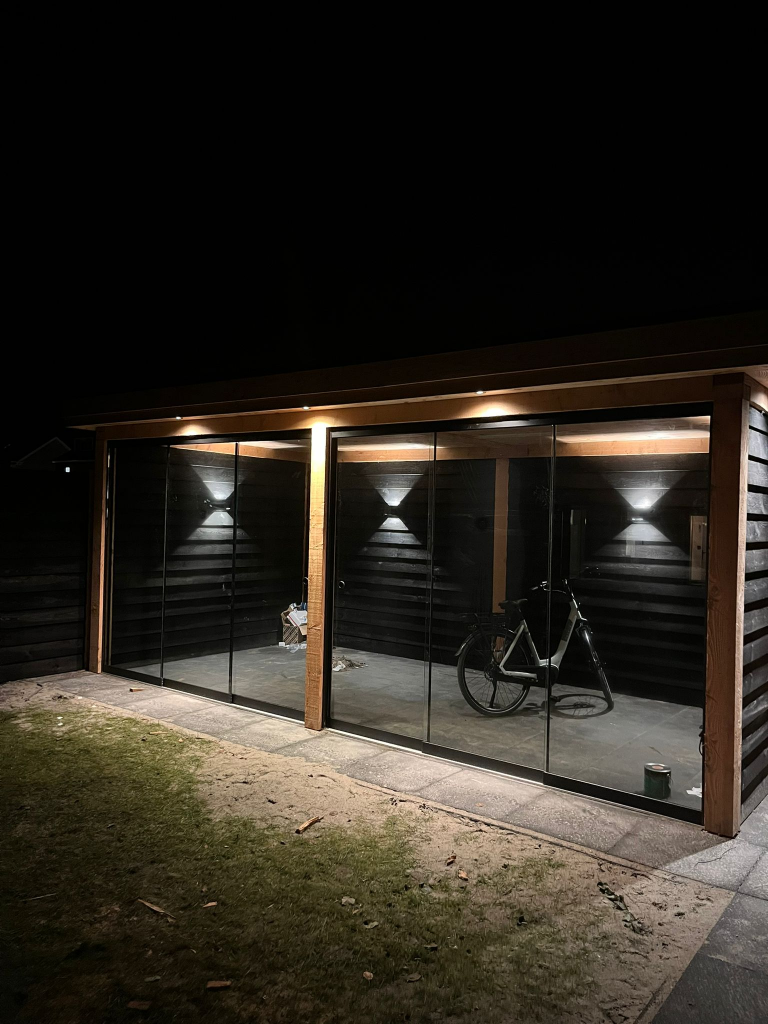 Eerst hebben we de vloer gerealiseerd en daarna een 6 bij 3 meter tuinhuis met een overstek en verlichting wat automatisch aan gaat als het donker gaat worden.