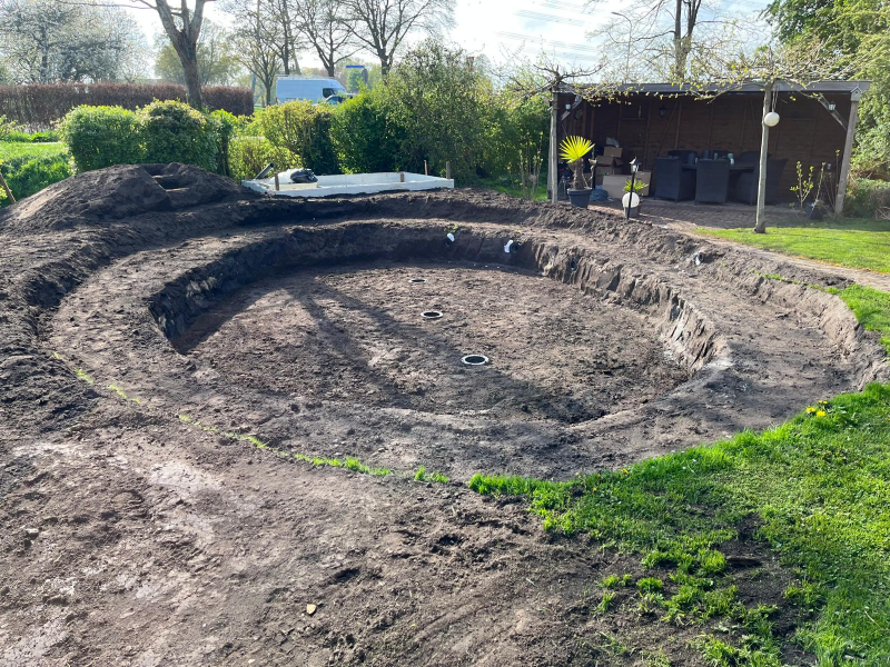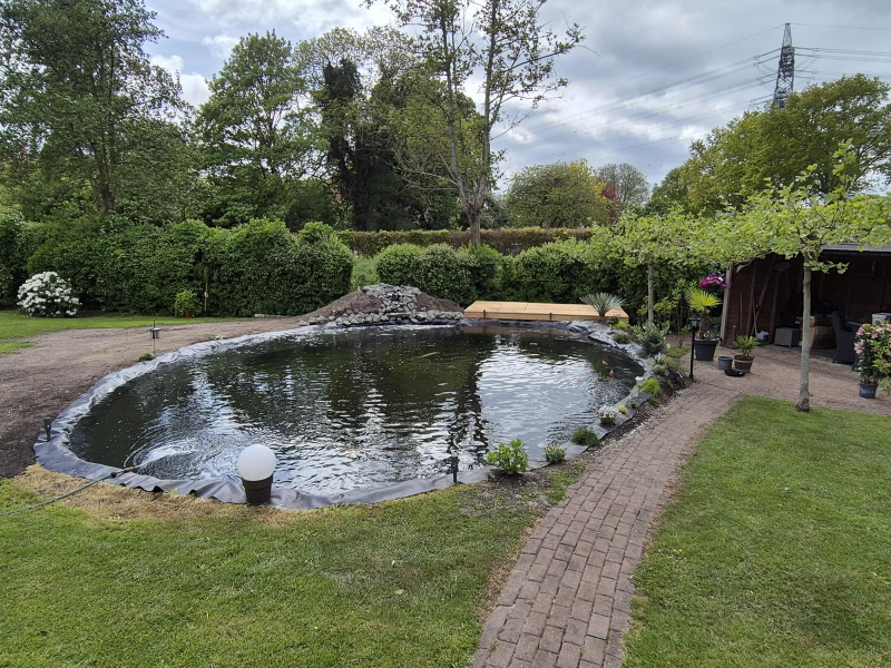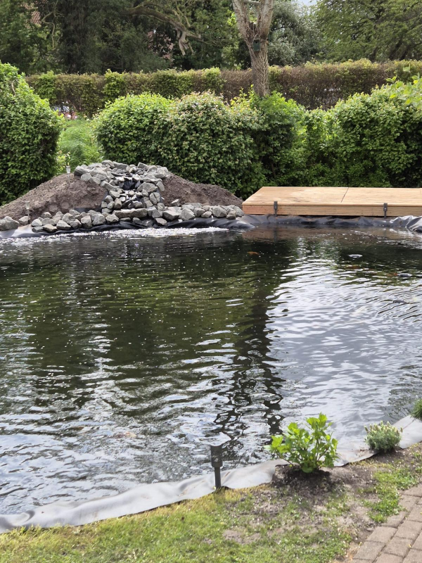 Een hele mooie grote tuin verdiend ook een mooie vorm vijver wat goed past in het geheel van de tuin.